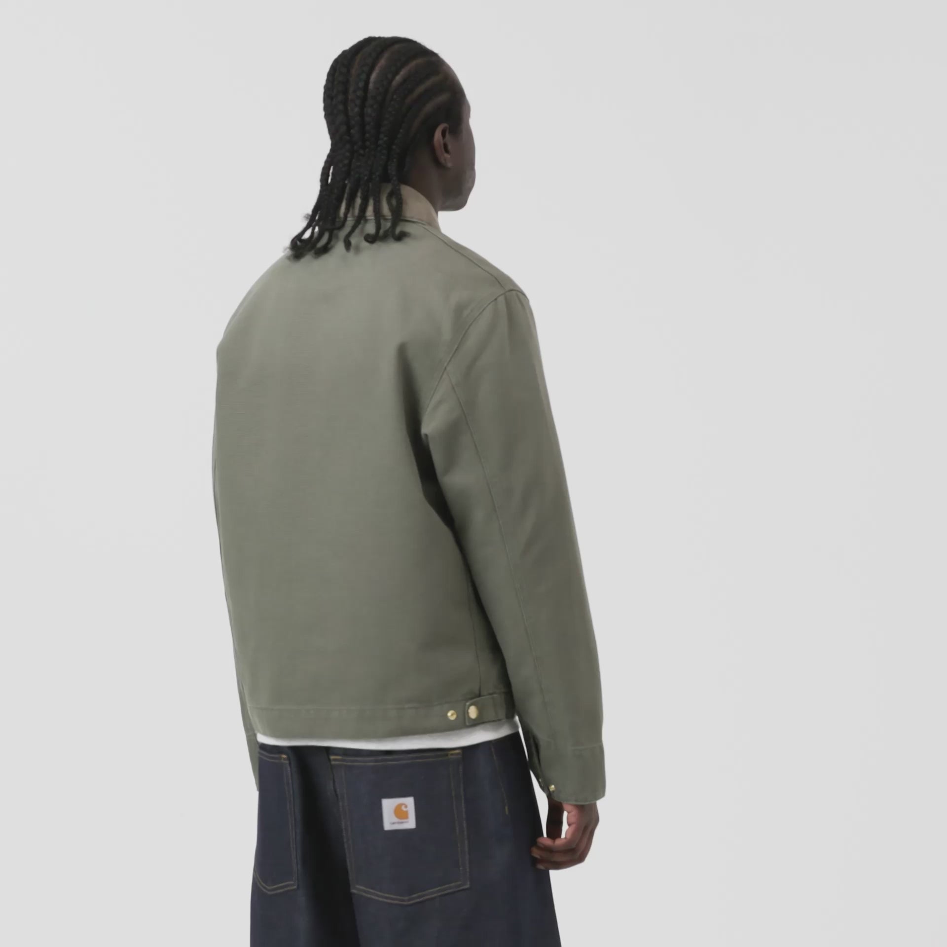 デトロイトジャケットは裏地なしの春夏仕様で、丈夫なディアボーンキャンバスを使用しています。シルエットはややクロップドに仕上げており、コーデュロイの襟、ジップ付き胸ポケット、ゴールドトーンのジップクロージャーが触感のアクセントを添え、トリプルステッチのディテールが耐久性を高めています。胸元のカーハートWIPスクエアラベルがデザイン全体を完成させています。