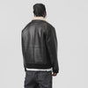 シェプトンジャケットは、人工皮革製でパイル素材でシェルパフリースのトリム襟と裏地を備えています。ブラックを基調としたレギュラーフィットのデザインと、フロントにダブルジップ、裾と袖口にリブが施されており、ラグラン袖とカンガルーポケットが特徴的です。スクエアラベルがデザインを完成させています。